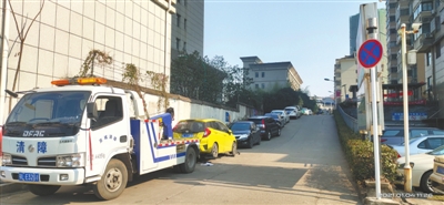 4日11点左右,记者在银泉大道尚城国际入口看到,一辆随意摆放在路边的私家车在执勤交警指挥下被拖走。当日,市公安局交警支队城区大队民警正在开展背街小巷乱停乱放整治行动,依法对乱停乱放的车辆进行处罚。