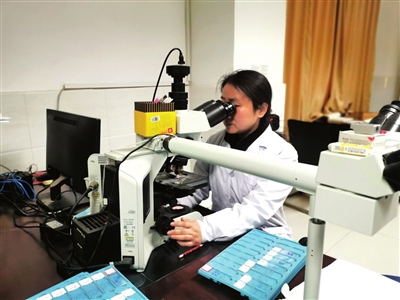 1月13日下午5点,黄海燕双手操作着显微镜,眼睛盯着病理切片,仔细地进行着病理诊断报告审查复核工作。