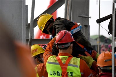 1月24日,一名被困矿工成功升井。当日,记者从山东栖霞笏山金矿事故应急救援指挥部了解到,通过回风井,被困“四中段”和“五中段”的共11名矿工成功升井。