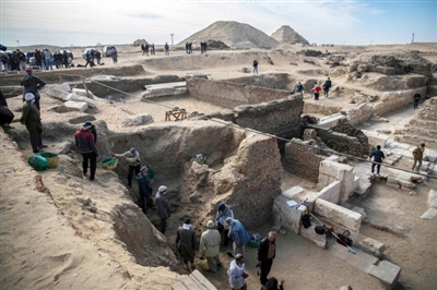 近日,埃及开罗南部,工人们在塞加拉墓地挖掘一处遗址。墓园位于埃及首都开罗以南30公里处,此次发现的墓园包括泰提国王的妻子纳尔特王后的陪葬庙宇,以及新王国时期的竖井、棺材和木乃伊,这些木乃伊的历史可追溯到2500多年前。