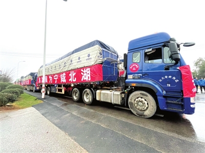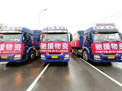 本报讯 记者吴文谨、王馨茁报道:25日上午,在京港澳高速咸宁北站,40余辆贴着“铭记河北大恩大爱 湖北咸宁为冀加油”“同舟共冀 天下咸宁”等标语的运输车辆,饱含着咸宁干部群众的深情挂念,满载着医疗设备及防控物资,踏上了驰援河北的征途。