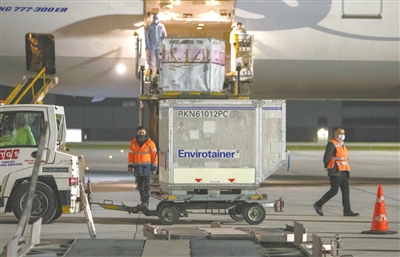 1月25日,在土耳其伊斯坦布尔国际机场,工人卸载装有中国新冠疫苗的航空运输箱。当日,650万剂中国新冠疫苗运抵土耳其。 据新华社
