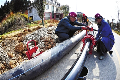 20日,通山县燕厦乡燕厦村二组,施工人员在铺设自来水管道。