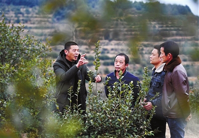 20日,通山县燕厦乡潘山村油茶基地,当地农技专家陈文革在为农户传授油茶管理知识。