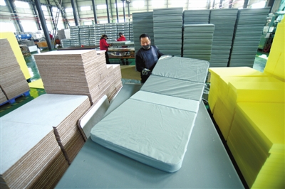 3日,通山县经济开发区内,湖北东洋佳嘉诚丰海绵制品有限公司生产车间,工人正在赶制订单。