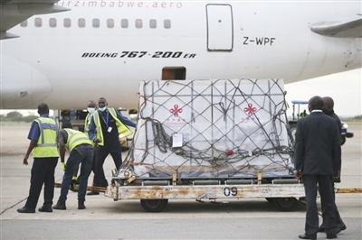 2月15日,工作人员在津巴布韦首都哈拉雷的罗伯特·穆加贝机场卸载中国政府援助的新冠疫苗。这是这个南部非洲国家获得的首批新冠疫苗。 据新华社