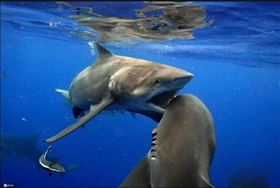 近日,美国佛罗里达州海岸,发生一场史诗般的水下大战,两条牛头鲨同类相残,进行激烈的搏斗,其中一条咬下对方脸上的一块肉。