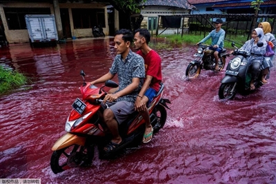 印度尼西亚中爪哇省一家蜡染工厂遭遇洪水,不仅把当地一条河流变成“红河”,涌入村里的洪水也红彤彤一片,引得民众竞相拍照。