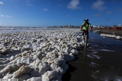 近日,阿根廷马德普拉塔,海水夹裹着大量白色泡沫冲上海岸,沙滩上仿佛堆满积雪。据当地媒体报道,专家解释这是一种自然现象。