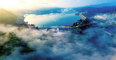 青山水库总库容4.48亿立方米,平均水面18平方公里。境内有大小岛屿500余座,水陆库汊错落有致,与周边的森林、草地构成了一幅自然山水生态画卷。
