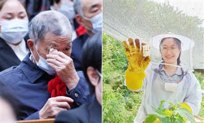 拼版照片:左图为黄文秀的父亲黄忠杰在表彰大会上(新华社记者刘彬摄);右图为黄文秀生前工作照(资料照片)。