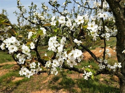 这里不仅有梨花满园,待到丰收时节,各式品种的梨子沁人心脾。梨花被赋予纯洁的白色,苏轼曾作诗“梨花淡白柳深青,柳絮飞时花满城。”可以想象满城尽是梨花飞舞,清香淡雅,引人如痴如醉。