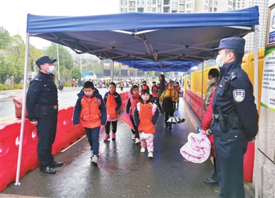 开学当天,由 62名民(辅)警组成的13个亲情护校队小组,分赴市区各中小学幼儿园,开展常态化护学。