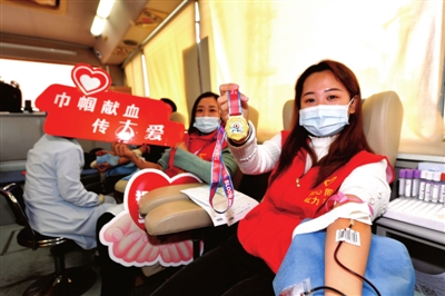 3月3日,中建三局北京公司工作人员在采血车上献血。