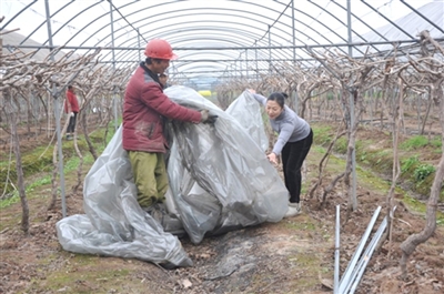 3月3日,赤壁市烟草专卖局驻村“第一书记”龙红霞(右一)在柳山湖镇易家堤村帮助农户搭建葡萄棚。
