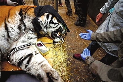 近日,在法国米卢斯,兽医给14岁的西伯利亚虎动手术,治疗其口腔感染。