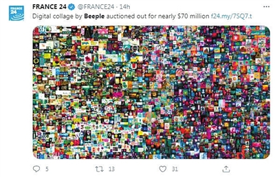 近日,佳士得拍卖行以非同质化代币(NFT)形式拍卖的纯数字艺术品《每一天:前5000天》,以超6934万美元的价格成交,被认为是“数字艺术史的里程碑”。该作品由美国数字艺术家Beeple创作,他从2007年起,每天创作一张数字作品,累积5000张数字作品完成此一作品。据介绍,5000张作品融为一张画作,可个别点击单一作品放大。