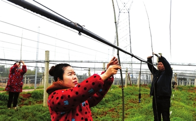 3月15日,赤壁市官塘驿镇西湾村猕猴桃基地,当地村民在进行插杆绑扎。该基地1200亩,由赤壁神山兴农有限公司投资5000万元兴建,采取“公司+基地+农户”的发展模式,带动当地农民稳定增收。基地全部建成后,预计实现年产值6000万元,可带动150多名村民人均增收5万元。