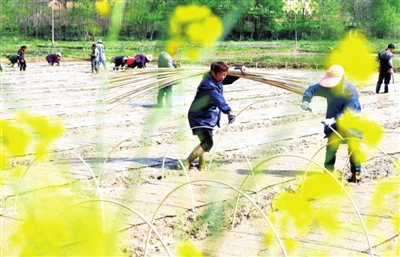 24日,赤壁市中伙铺镇南山村优质稻高效模式示范片集中育秧基地,村民在农艺师团队的指导下进行摆盘、填土、播种、覆膜等。