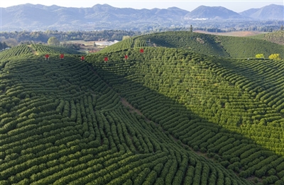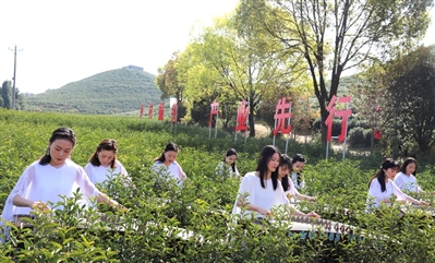 绵延起伏的山坡,苍翠欲滴的茶山之间,山的隽永、茶的灵动,花海茶田中,无限春光尽收眼底,只见采茶姑娘们正在忙着采摘明前茶……