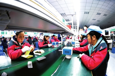 3月24日,通山县星火原实业有限公司员工在组装多功能遥控器。