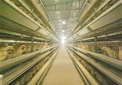 雷绍全告诉记者,和传统养殖模式相比,这里的蛋鸡生长环境非常舒适,全部住在4层“高楼”里,一个鸡舍原来只能存栏1万只蛋鸡,现在增加到了3.5万只,不仅节约了养殖空间,而且更有利于蛋鸡健康生长。