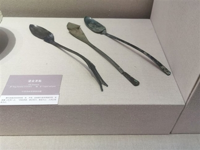“茶则虽小,但形态别具一格。”博物馆专业讲解人员饶洁介绍,展出的鎏金茶匙融合了实用型、装饰性、文化性于一体,体现了古时劳动者淳朴、健康的审美情趣,以及人们对美的认识和追求, 其高超、精湛的制造技艺又闪烁着中国古代劳动者智慧的光芒。除铜质外,从现存的唐代茶则来看,尚有银、银鎏金、金等材质,而不同材质也从另一方面显示了器物主人的身份高低。