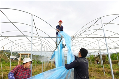 4月8日,在位于通山县通羊镇茅田村的湖北远程农业科技有限公司水果基地,村民一边搭建钢架大棚一边覆膜。