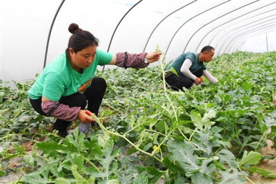 4月21日,嘉鱼县簰洲湾镇中堡村连片西瓜种植基地,来自浙江台州的牟同飞夫妇在大棚内为西瓜藤蔓打叶。