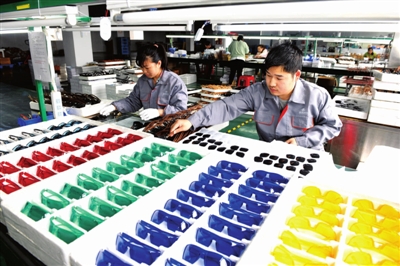 4月21日,嘉鱼县返乡创业孵化园康晨眼镜有限公司,工人在安装镜片。该公司是一家返乡创业企业,于去年8月试生产。