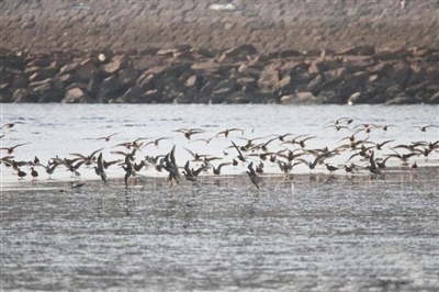 成群斑尾塍鹬在青岛楼山河入海口觅食。近日,楼山河口迎来一群神奇的飞行冠军斑尾塍鹬。