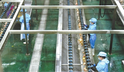 日前,咸安区贺胜桥镇温氏佳丰产业园肉鸡加工车间,工人们正在流水线上忙碌。