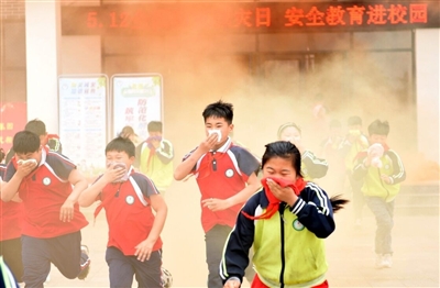 5月12日,山东省临沂市郯城县马头镇中心小学学生在进行避灾疏散演练。