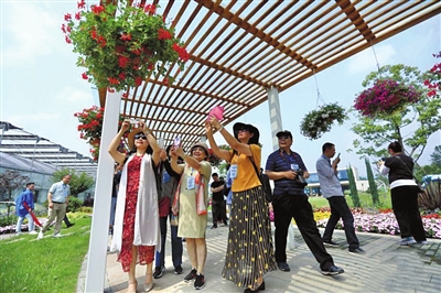 5月12日,海外华文媒体代表在班纳利种业(成都)种苗繁育创新基地拍摄盛开的鲜花。当日,来自美国、俄罗斯、加拿大、日本等15个国家和地区的21家海外华文媒体代表走进四川省成都市郫都区,探访郫都区乡村振兴建设。