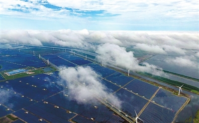 5月12日,航拍江苏东台沿海云雾缭绕大美风光。这里按照集约集聚的开发理念,形成上有风力发电、中有光伏利用、下有水面养殖的“风光渔”立体开发模式,实现滩涂资源的高效利用与生态开发。