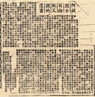 1941年1月,国民党顽固派制造“皖南事变”,1月20日,时任中共鄂西特委书记的何功伟因叛徒出卖而被捕。在狱中,审讯、说服、威逼利诱无效,国民党利用其父亲去劝降,为阻止父亲来劝降,何功伟写下了一封1100多字的规劝信,信中,何功伟将生死置之度外,浩然正气充满字里行间。“然揆诸宁死不屈之义,儿除慷慨就死外,绝无他途可循。为天地存正气,为个人全人格,成仁取义,此正其时”“而奈儿献身真理,早具决心,苟义之所在,纵刀锯斧鉞加诸颈项,父母兄弟环泣于前,此心亦万不可动,此志亦万不可移”。“胜利之路,纵极曲折,但终必导入新民主主义新中国之乐园,此则为儿所深信无疑也”。