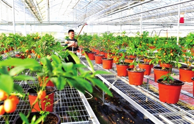 5月10日,咸宁杨畈农业高新技术产业示范区研发试验区,管理员正在棚内给培育的金钱桔浇水。