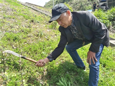 “为了保护堤坝和水质安全,堤坝上的野草不能除根,也不能用药,所以清理起来比较麻烦。必须在离根两三厘米的地方割除杂草。”严早望一边弯腰割草一边说道。