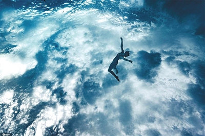 大溪地塔拉瓦奥,42岁的MarianneAven-turier在海中自由潜水,丈夫AlexVoyer为她拍摄了一系列自由潜水大片,不过这些照片却让人产生了错觉,画面中MarianneAventurier不像是潜水游泳,看起来像是在空中飞翔和跳伞。