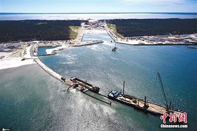 当地时间5月10日,波兰北部Skowronki的维斯瓦河岬的航道施工现场。该项目将通过海上连接维斯瓦河环礁湖和格但斯克湾来实施,目的是缩短、加深和简化通往波罗的海的海上航线。(本报综合)