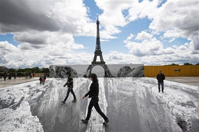 当地时间5月19日,法国巴黎特罗卡德罗广场上出现巨型3D画作,埃菲尔铁塔仿佛架在峭壁之上,铁塔之下的山谷间还有穿行的车辆。 (本报综合)