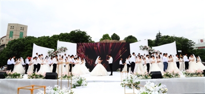 上午10时,典礼在一场精彩的婚纱模特走秀后正式开始,60对新人在婚礼进行曲的伴奏下依次登上舞台,在他们当中有年过七旬白发苍苍的金婚老人、有坚守疫情防控一线的医护人员、有奋战社会治安防控一线的公安干警、有筑牢防疫第一道防线的基层街道网格员、也有服从防控要求做好居家隔离的普通民众,此时此刻,身披白纱的他们是最幸福的人。