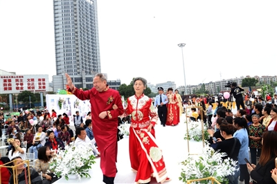 金婚夫妇定正英、王鹤鸣激动地说,和老伴相守近50年,经历了很多风风雨雨,幸运的是生活在这个和平年代。要感谢祖国,感谢伟大的共产党。祝福所有的新人们一生健康幸福,白头偕老。