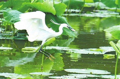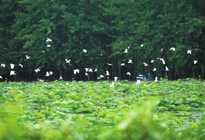 陆溪镇水生植物众多,良好的生态环境引来成群白鹭在水边、田间觅食嬉戏,构成一幅人与自然和谐共生的美好画面。