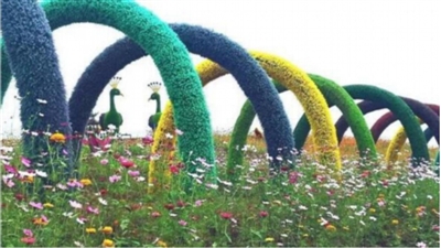 花海景区门口,熊大熊二等卡通人偶开心地向游客招手示意,一阵清风吹过,未见花容却先闻花香。我们一行由西往东步行,跟随络绎不绝的游人进入花的海洋。