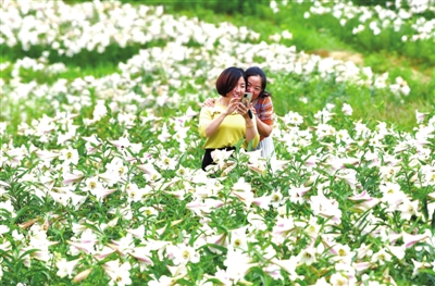 5月25日,通山县通羊镇茅田村百合基地,游人正在盛开的花丛间游玩、留影。