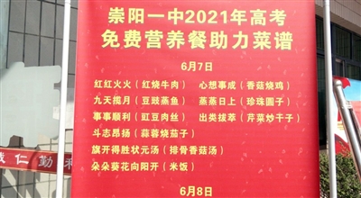 在崇阳一中食堂,该校后勤服务中心提供特色菜谱,供高考考生免费食用,寄托吉祥寓意的菜名,鼓励学子坚定信心、决胜高考。