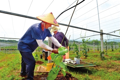 6月9日,赤壁市官塘驿镇西湾村猕猴桃基地,果农正在补种猕猴桃幼苗。