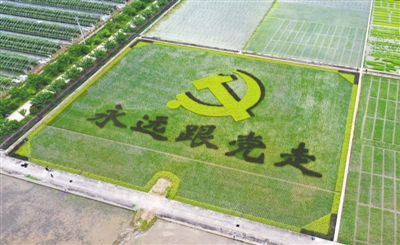 6月17日,在市农科院向阳湖试验基地,农业专家以农田为卷、以科技为笔,在田间创作的“永远跟党走”彩色稻田画,初具雏形。