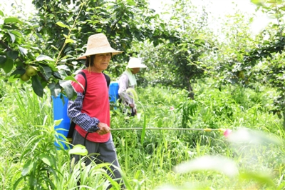 6月15日,嘉鱼县新街镇蜀港村田上庄园香水梨基地,果农在进行田间管理,为秋季丰收做充分准备。
